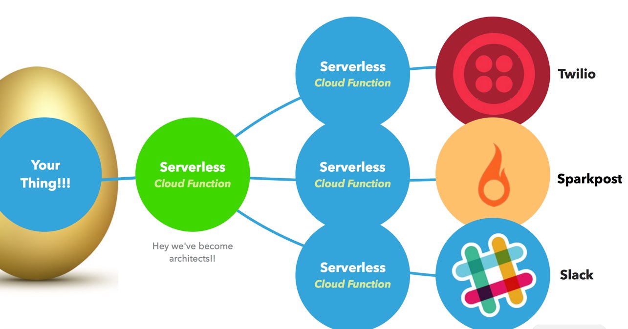 Say your thing needs to send a text message. Service: twilio – it’s an API and they help you send SMS messages. Super useful and cool and super cheap.