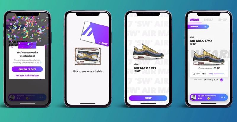 are currently involved and fully understand how powerful this alternative form of branding is for them aglet is the virtual currency and also the name of the app. Every user starts with one of three basic pairs of sneakers or trainers as we would say, and as you start to wear these sneakers or walk around in the real world you earn aggro. There the amount you earn is based on the rarity of the sneakers you are wearing at the time, virtually, of course, these sneakers degrade as you wear them, and they eventually need to be repaired. We charge and deadstock stations are located in coffee shops, landmarks and actual retail stores for sneakers, allowing a very organic way for stores and users of the app to connect.