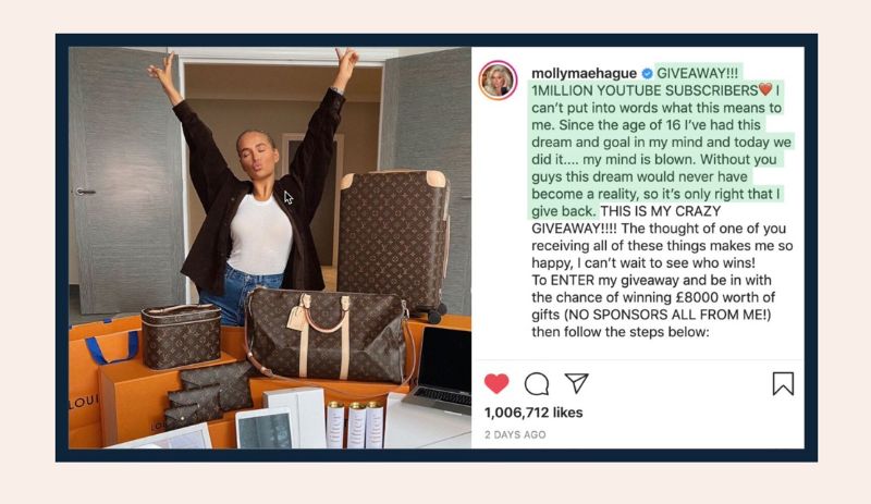 So I’m going to use this example from Molly Mae, a UK influencer. Molly spent $11,000 or 8000 pounds on a giveaway, specifically just for Instagram. And she disguised it as a celebration, somewhat of her 1 million followers on YouTube. As you can see, it worked. Here’s what she did.