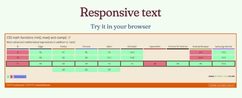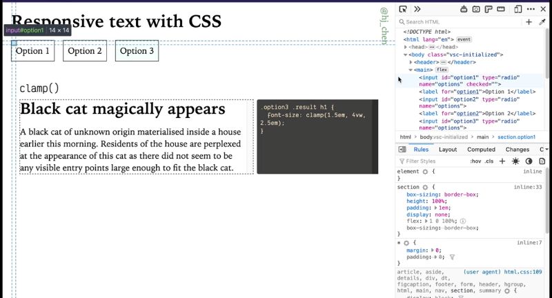 So that’s where the media queries, kick in. This formula itself is plugging in the values used for the breakpoints, as well as your target minimum font size and maximum font size. What has been interesting recently this year, is that we’ve had a slew of CSS math functions that have gained wider support recently. Among them is the clamp function, which allows us to pick a value within a range between a defined minimum and maximum. This is a function that takes in three parameters: the first one being the minimum, the next one being the preferred value, and the last one being the maximum value. A function like this is rather useful if your preferred value is dependent on something you don’t control directly like like viewport units right and this clamp function essentially allows us to do what Mike’s function did in option two, but with a much more simplified syntax.