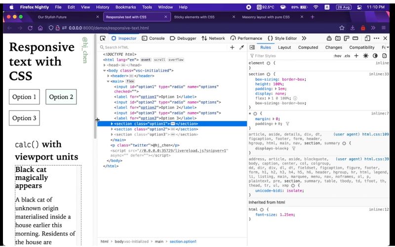 So I first want to remind everyone that CSS has come of age. Now if we take the first WPC recommendation as a birthday milestone that was December of 1996. So CSS is going to be 25 years, soon, and boy has it grown up. 🎉 Well, from a time where CSS was not really meant for doing layouts until today, where CSS is the go-to method for creating websites. We have more than 500 CSS properties. Today, providing us with a much wider vocabulary, with which we can communicate to the browser how we’d like our webpages to look and behave. And there are some things that we can now build with CSS that we could not before. Without the help of JavaScript or some, you know, Semi clunky workarounds, so I’m going to take this time to kind of share with all of you, some of the solutions, and also to sort of paint a picture of the CSS we have now, and what is on the horizon of CSS that is to come. So let’s start off with responsive typography. So, what we’re going to talk about first here is responsive text so for textual content on the web. I would say the key concern is text legibility and readability. There have been a number of techniques developed over the years as newer CSS properties become available.