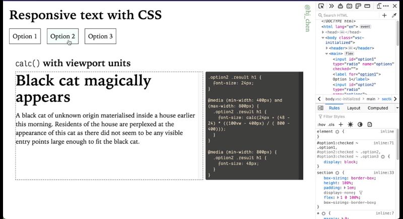 So this is how it would look, there will be a specific breakpoint and you adjust your text size accordingly. After some time, there were some people who asked if it is a possibility that we let our text, grow and shrink dynamically. This is a digital media responsive and this became possible with CSS. Only when viewport units were introduced for sizing purposes it could be applied to font sizes as well. So this particular technique was introduced by Mike Missoula back in 2016, and it’s making use of the calc function and viewport units for font sizing. So he came up with sort of a formula. He has a very extensive article that explains exactly how he came up with the formula. The TLDR version of it is that you still have to use media queries, but these media queries allow you to limit the font scaling within a range that you control so you can sort out the minimum and maximum font sizes. If you want to see how this works, essentially there’s a maximum and minimum size, at about this size it was really really narrow with the header text does a trick anymore. But between 408 100 pixels, there’s this like growth period for the text, and then after 800, it kind of stops.