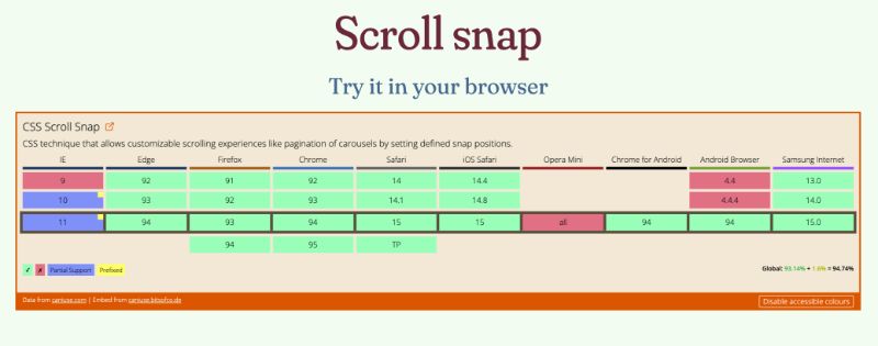 Well, I would say that with scroll snap, we have more options when it comes to this particular style of interaction. So before I go into it, let’s take a look at the support, it’s not bad. Honestly, this CSS has been around for quite a while but the specification I’ve gone through a number of modifications so the properties have changed somewhat from their first integration. So today, the main properties we will be looking at are our scroll snap-type, which is applied on the container, and scroll snap alignment for the child elements within the container. So, easier to show than to talk about going to switch browsers switch things up. So, first of all snap type. The values that you can apply to this property would be mandatory versus proximity. These values determine how strictly the browser would snap to a snap point. So right now I have it set to mandatory and this is the horizontal scroll situation we have here. So I’m using the keyboard. Hopefully, you can hear my clicky mechanical keyboard. It’s like one tap into snaps over. That’s what mandatory does, which is like a strict snap point. So, the browser will always snap for Snap Point, which kind of makes that keyboard navigation thing, very neat. You know one snap per slide. If you can get to the other value which is proximity. would call it a looser style of snapping, because, as you can see it’s like normal keyboard navigation. And then as it nears the edge. It kind of just snaps over.