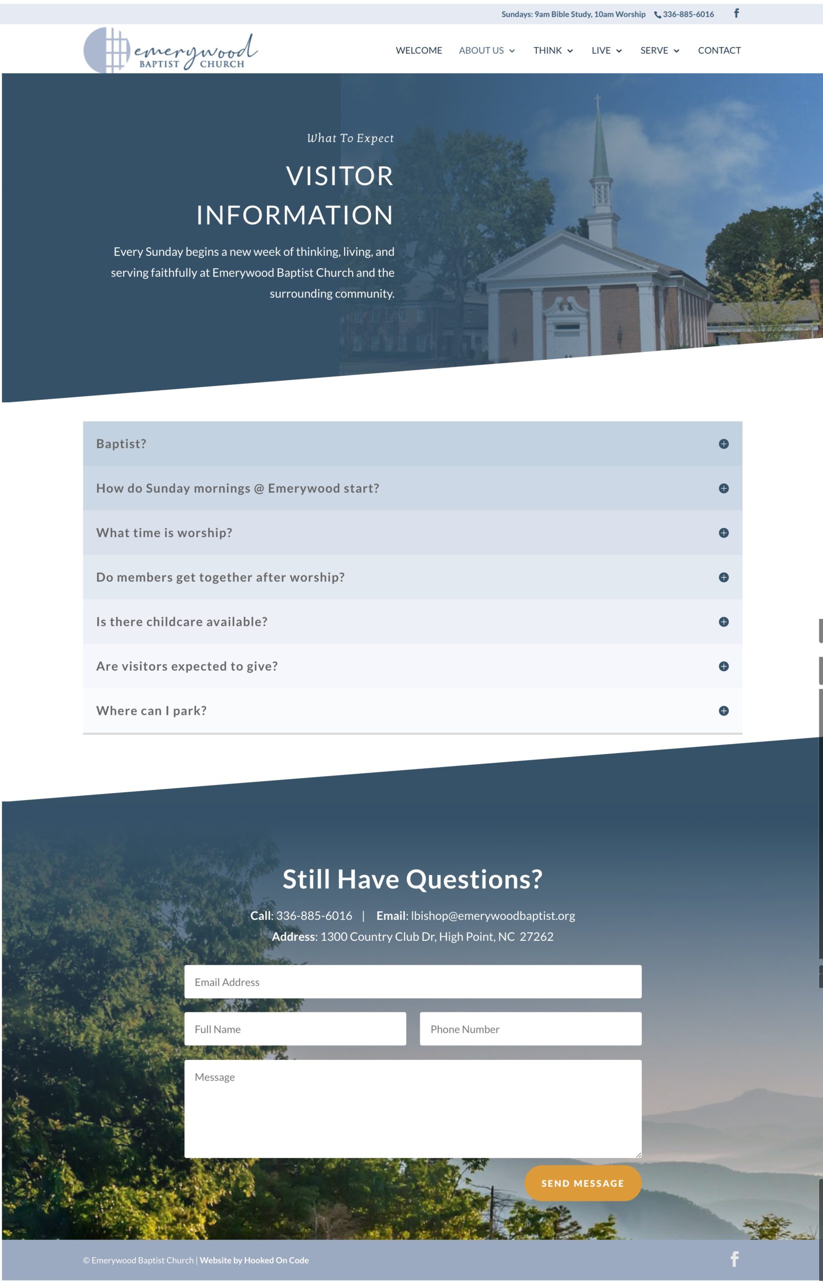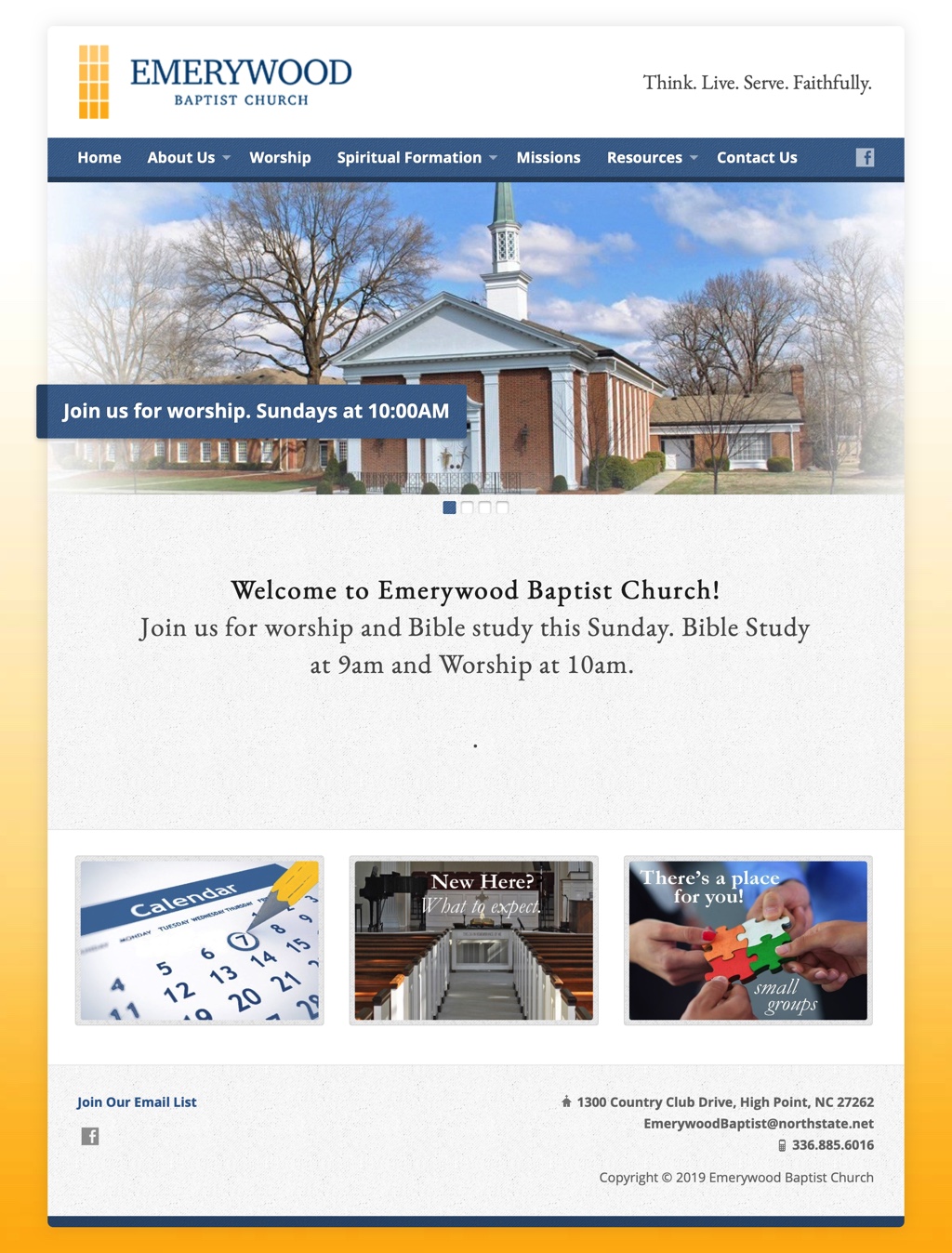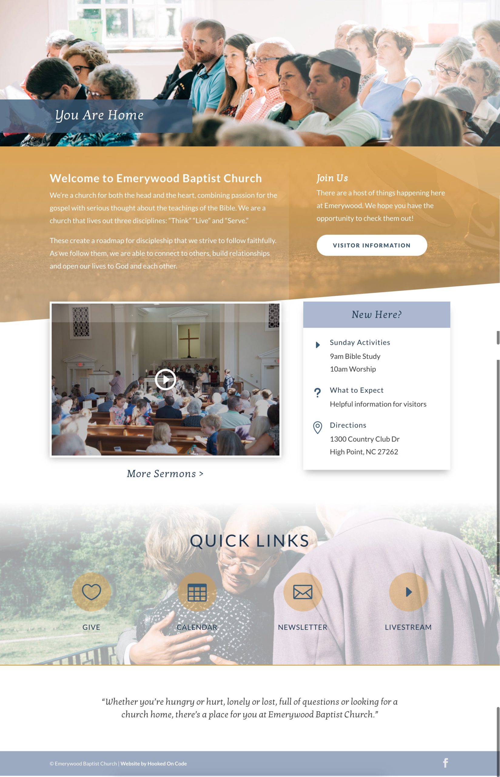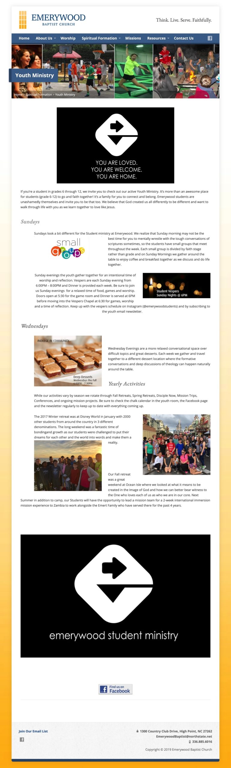 Emerywood Baptist Church reached out to our team because their website wasn’t capturing their incredible community’s purpose and identity. The Emerywood congregation is warm and inclusive, their history is unique and interesting, their grounds are gorgeous, and their mission is beautiful. Their existing website had become stagnant, dated, and uninformative. Our mission was to create a new design that would give visitors the information they needed in a way that stayed true to the vibrant church culture.