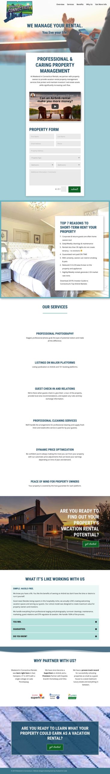Many times entrepreneurs and small business owners need a website that falls somewhere between a landing page and a full website. They aren’t ready for a full size website in regards to growth, content, or budget, but they need something that can hold information about their company, capture their brand and personality, speak to their audience, and engage their visitors. We had the pleasure of building a scrolling website for Weekend in Connecticut. Our One Page Websites are our most popular service among entrepreneurs, solopreneurs, and even some startups because it provides all the information of a website with separate pages in an engaging scrolling format, while being easy on the budget.